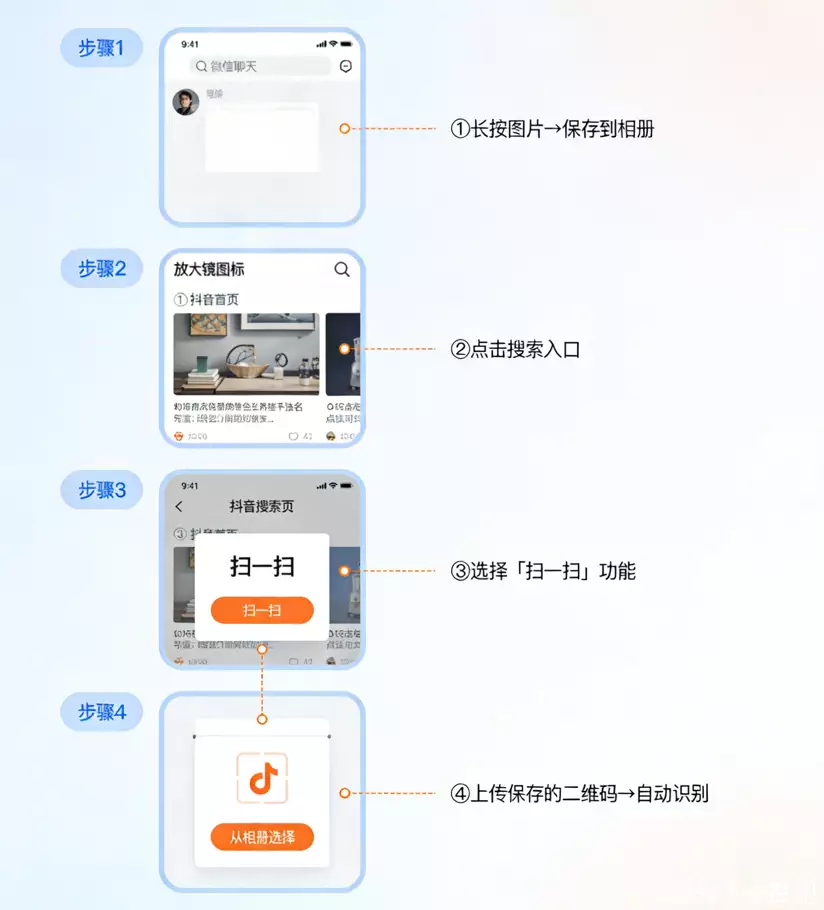 要是朋友分享抖音内容是二维码图片这种形式的将如何解决呢?要是收到了图片,我们可以把它存到手机相册里。然后开启抖音App,在首页右上角的放大镜图标(也就是搜索入口),点击进去之后选取“扫一扫”功能。